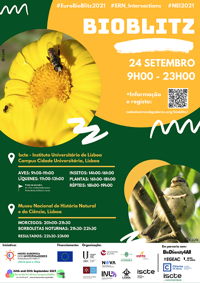 Esta atividade de ciência cidadã tem um propósito científico útil, mas é também um momento lúdico e de aprendizagem para os participantes. Entre as 9h00 e as 19h00 junte-se a diversos especialistas no Iscte, e vamos procurar medir a biodiversidade no campus da Cidade Universitária, em Lisboa, através da contagem das espécies de aves, líquenes, insetos, plantas e répteis. Ao final do dia visite-nos na Noite Europeia dos Investigadores e venha observar os morcegos e as borboletas noturnas no Jardim Botânico da ULisboa.