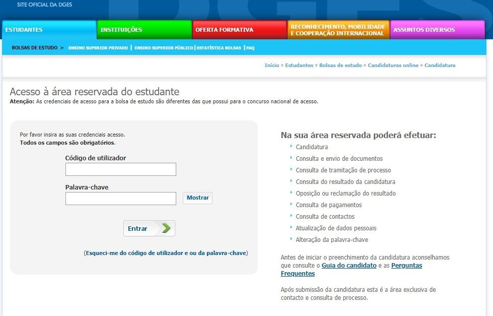 Se o candidato já efetuou candidatura a bolsa através da plataforma da DGES, as credenciais de acesso que já dispõe mantêm-se.