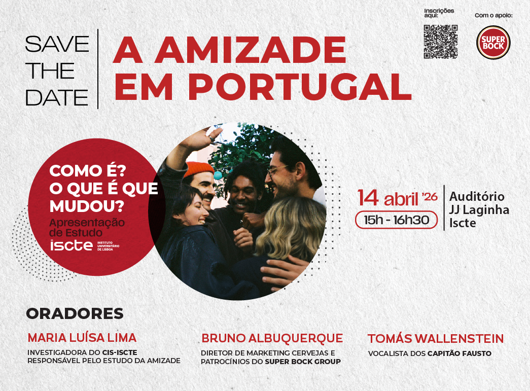 O Iscte - Instituto Universitário de Lisboa promove, com o apoio do Super Bock Group, a conversa “A amizade em Portugal: Como é? O que é que mudou?”, no dia 14 de abril, pelas 15h, no Auditório JJ Laginha. O evento pretende apresentar os resultados de um estudo realizado pelo Centro de Investigação e Intervenção Social (CIS-Iscte).