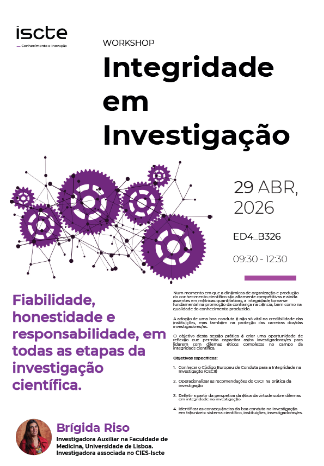 Este workshop realiza-se na manhã de dia 29 de abril, no edifício do Iscte Conhecimento e Inovação, e tem como oradora Brígida Riso, investigadora do CIES Iscte e da Faculdade de Medicina da Universidade de Lisboa. Vai analisar e refletir sobre o Código Europeu de Conduta para a Integridade da Investigação.