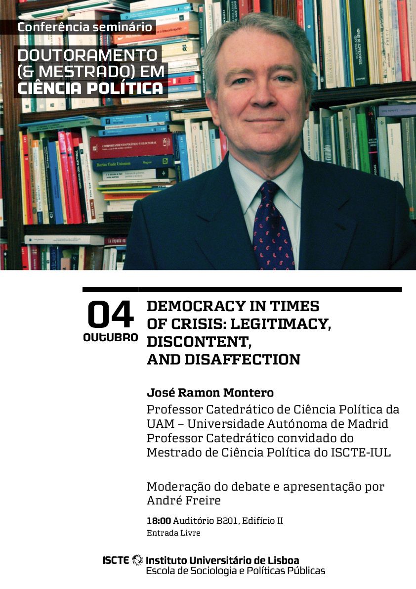 Terá lugar no próximo dia 4 de outubro no ISCTE-IUL uma conferência-seminário dedicada ao tema "Democracy in Times of Crisis: Legitimacy, Discontent and Disaffection".
