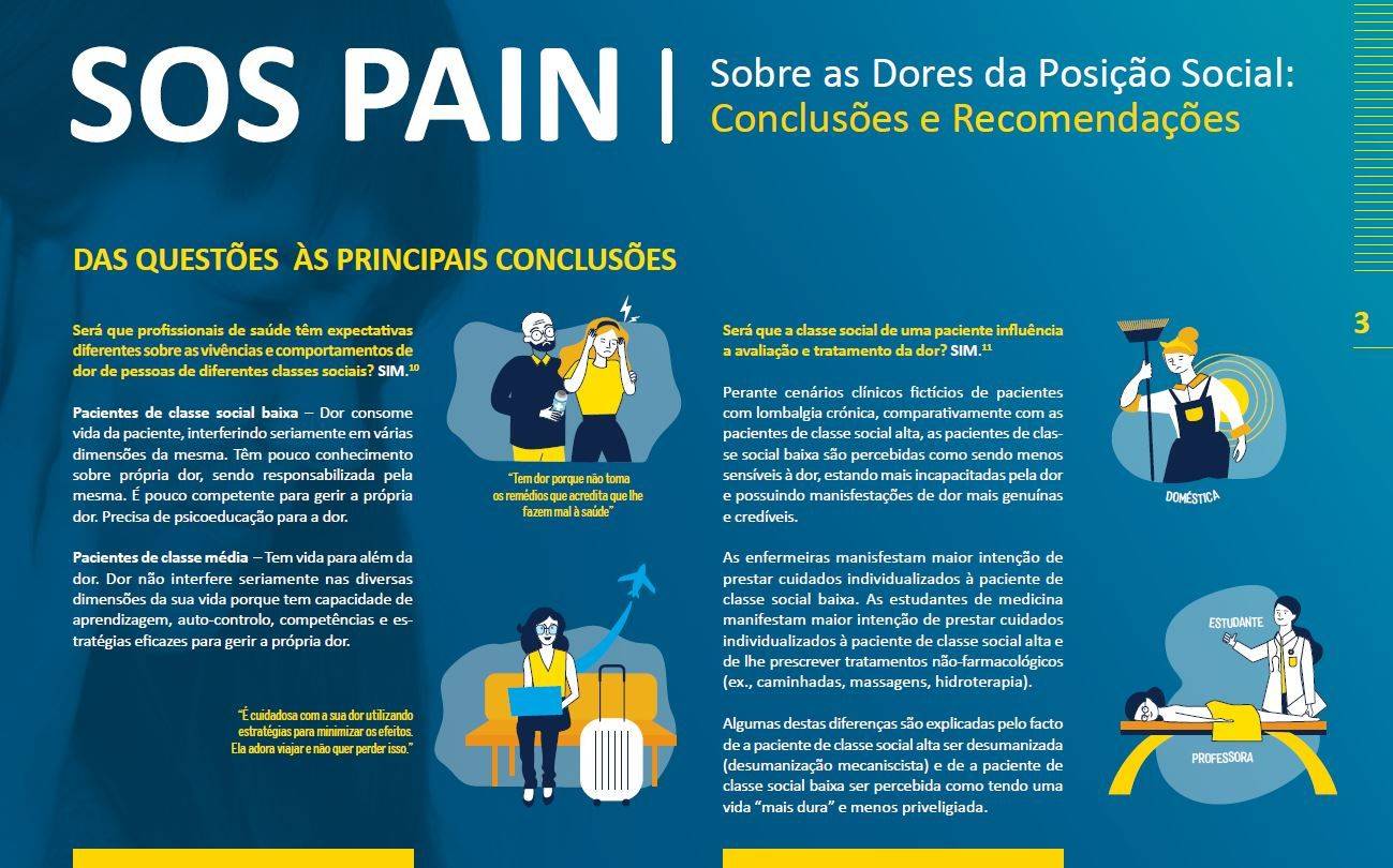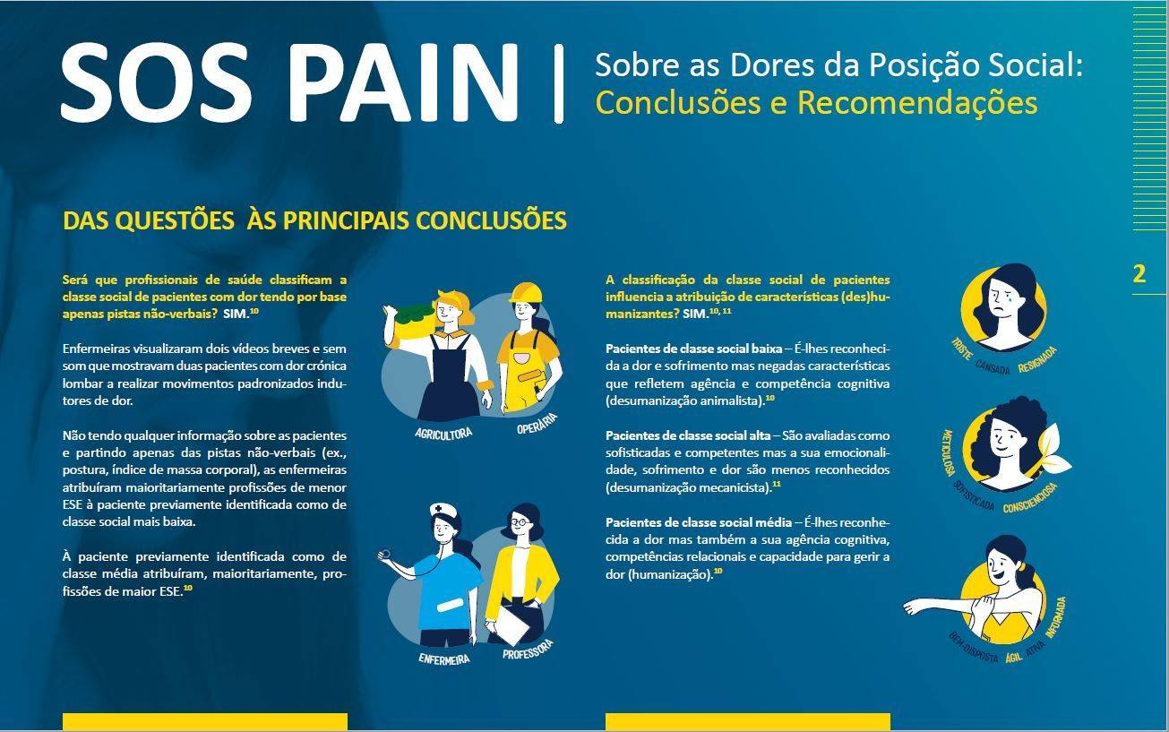 Neste estudo coordenado Sónia Bernardes, professora de Psicologia Social da Saúde do Iscte – Instituto Universitário de Lisboa, são feitas recomendações aos profissionais de saúde para que estes não ignorem, nos seus diagnósticos e terapêuticas, a origem social dos pacientes que sofrem de dor crónica.