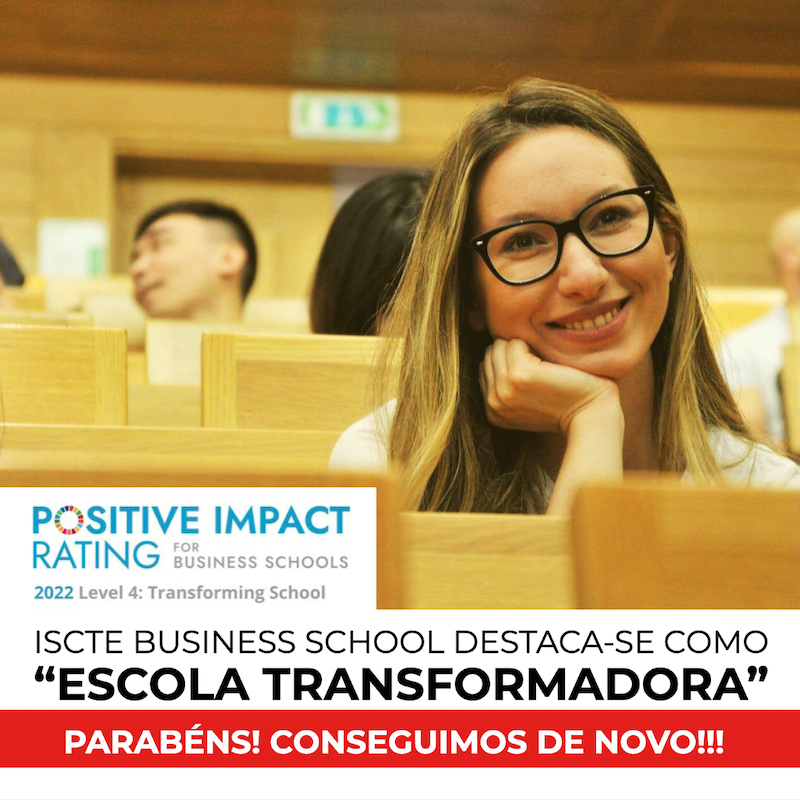 A Iscte Business School foi considerada “transformadora” no Positive Impact Rating – PIR, um rating internacional de 45 escolas em 21 países. Os elogios referem-se à capacidade da liderança da escola para motivar os alunos, medindo o seu grau de compromisso com a sustentabilidade, inovação e desenvolvimento pessoal dos estudantes. A avaliação foi feita pelos estudantes.