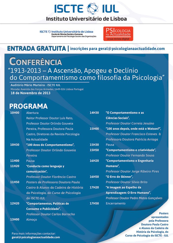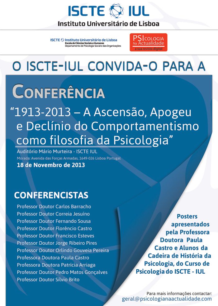 Terá lugar no dia 18 de Novembro de 2013 no Auditório Mário Morteira no ISCTE, uma conferencia dedicada ao tema “1913-2013 A Ascensão, Apogeu e Declínio do Comportamentismo como Filosofia da Psicologia”.