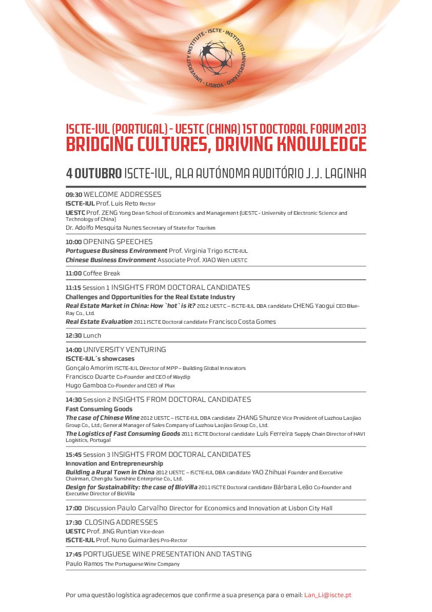O ISCTE-IUL realiza na próxima sexta-feira, dia 4 de Outubro, o primeiro grande Fórum Doutoral Portugal-China, evento cujo objetivo pretende dar a conhecer uma das grandes economias do século XXI, bem como todas as atividades que esta universidade desenvolve na China.
